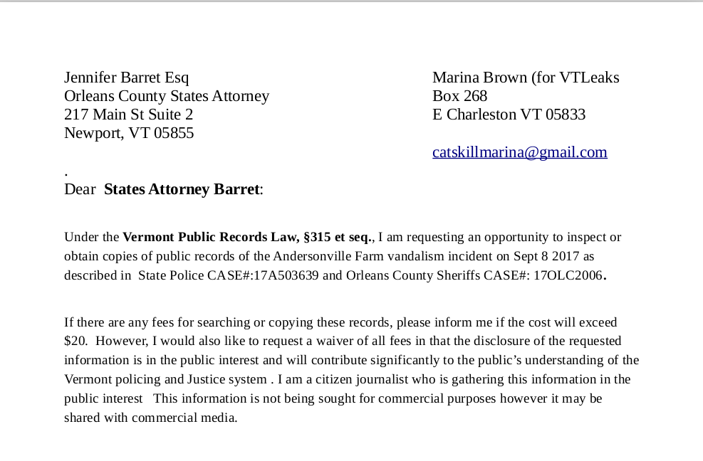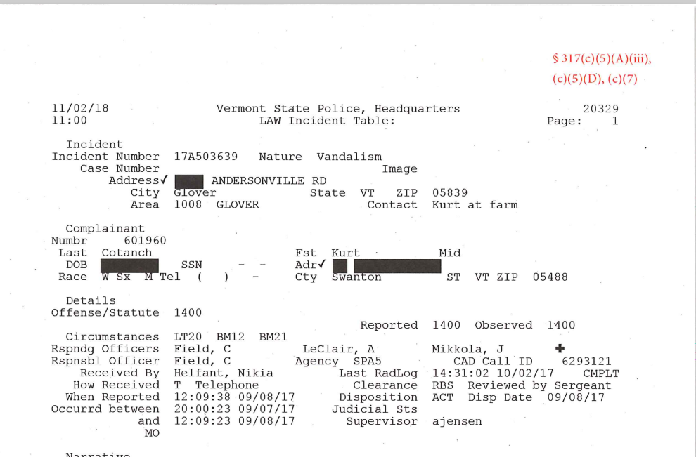 On Sept 7-8 2017 one or more vandals spray-painted vile racist graffiti on a barn in Glover VT and painted other vulger and threatening graffiti on mailboxes and on the road around the farm. A local family felt particularly threatened by the graffiti. I asked them if they wanted me to get the police report. They answered yes, so I agreed to try to obtain it. I expected it to be a quick process. I could not have been more wrong.